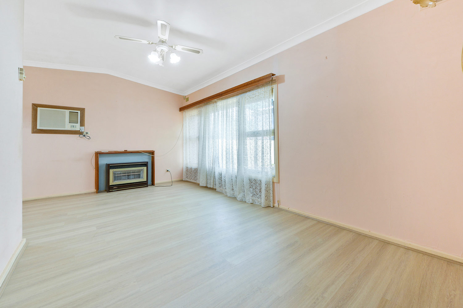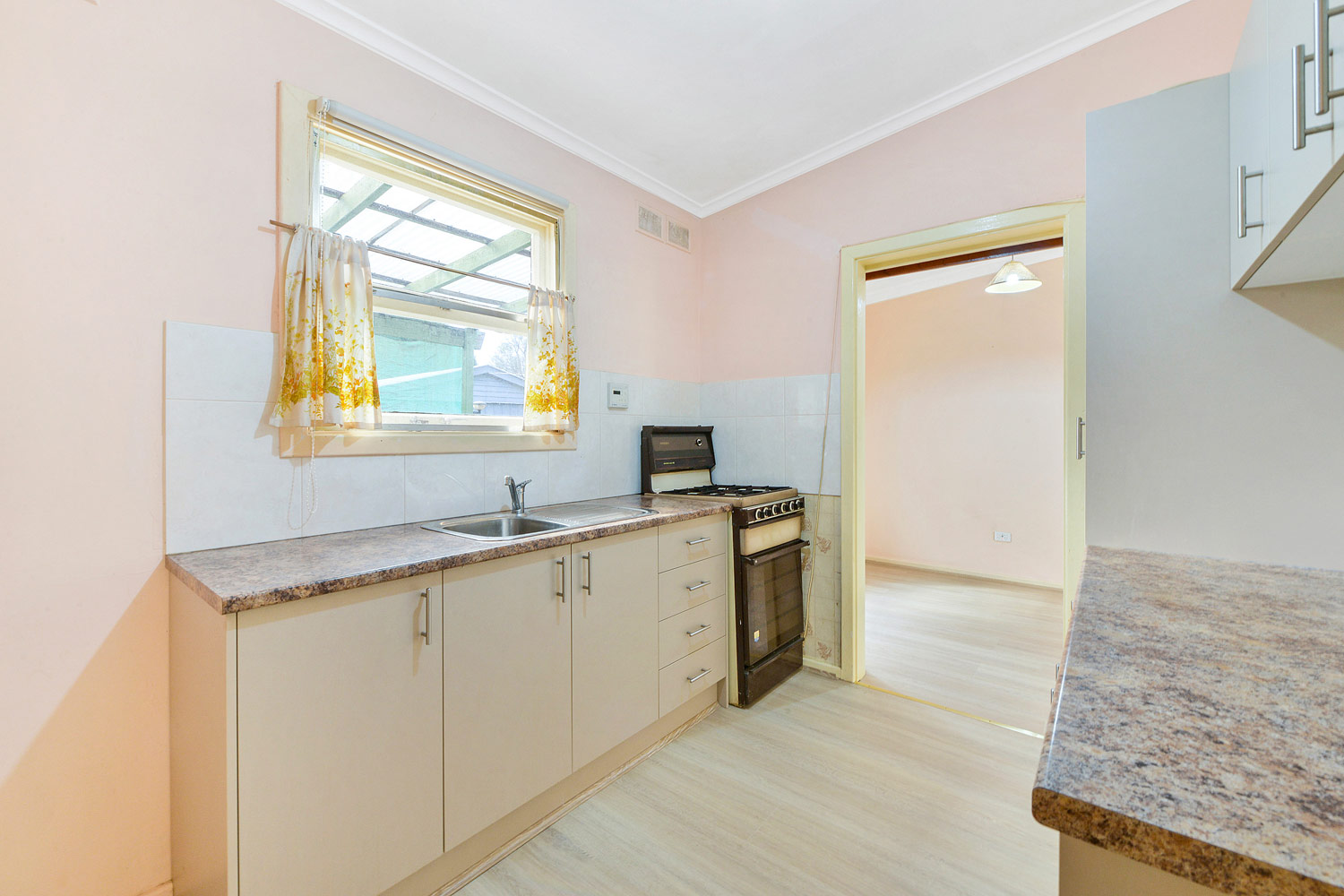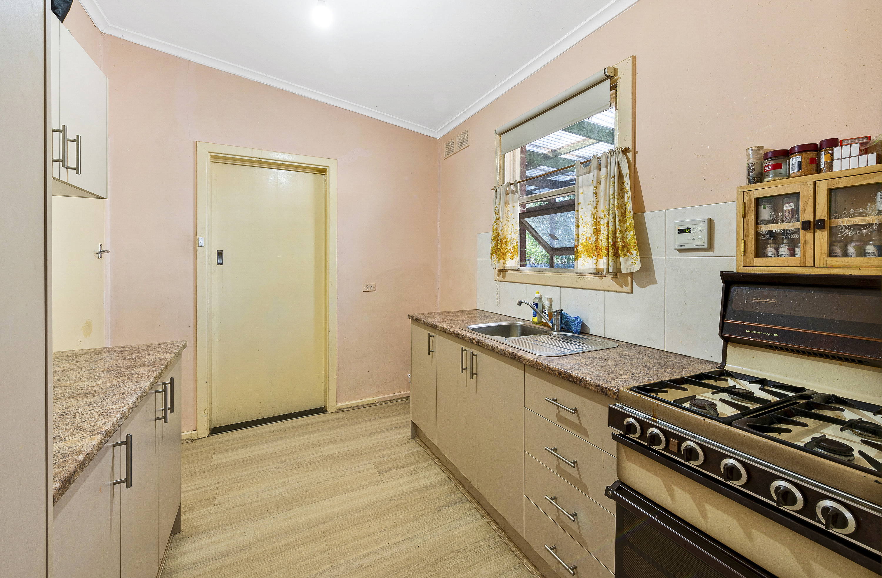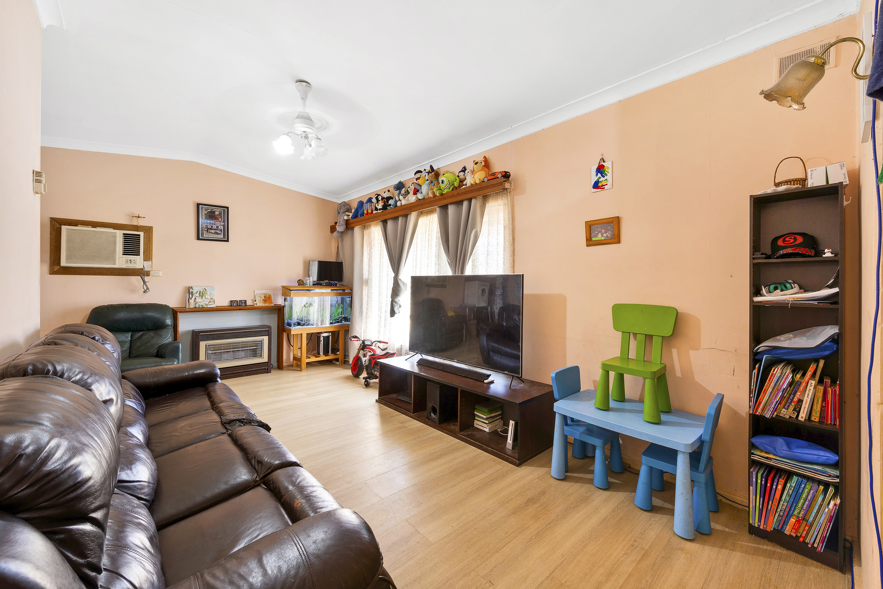 A traditional design features 3 spacious bedrooms across a generous 6 main room design. A spacious L shaped living/dining room offers crisp floating floors, ceiling fan wall air-conditioner and gas heater, while a bright galley style kitchen features stone look bench tops, meet cabinetry, wide sink and free-standing gas stove.