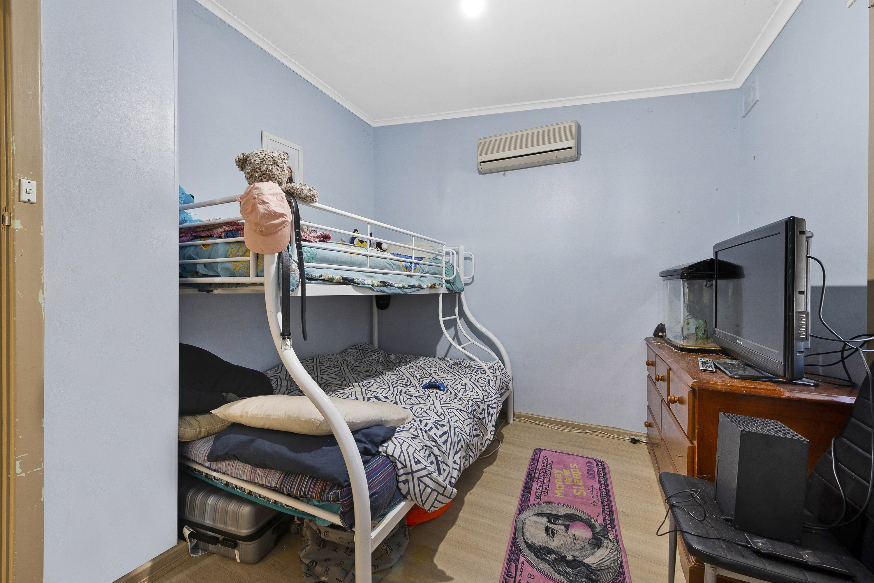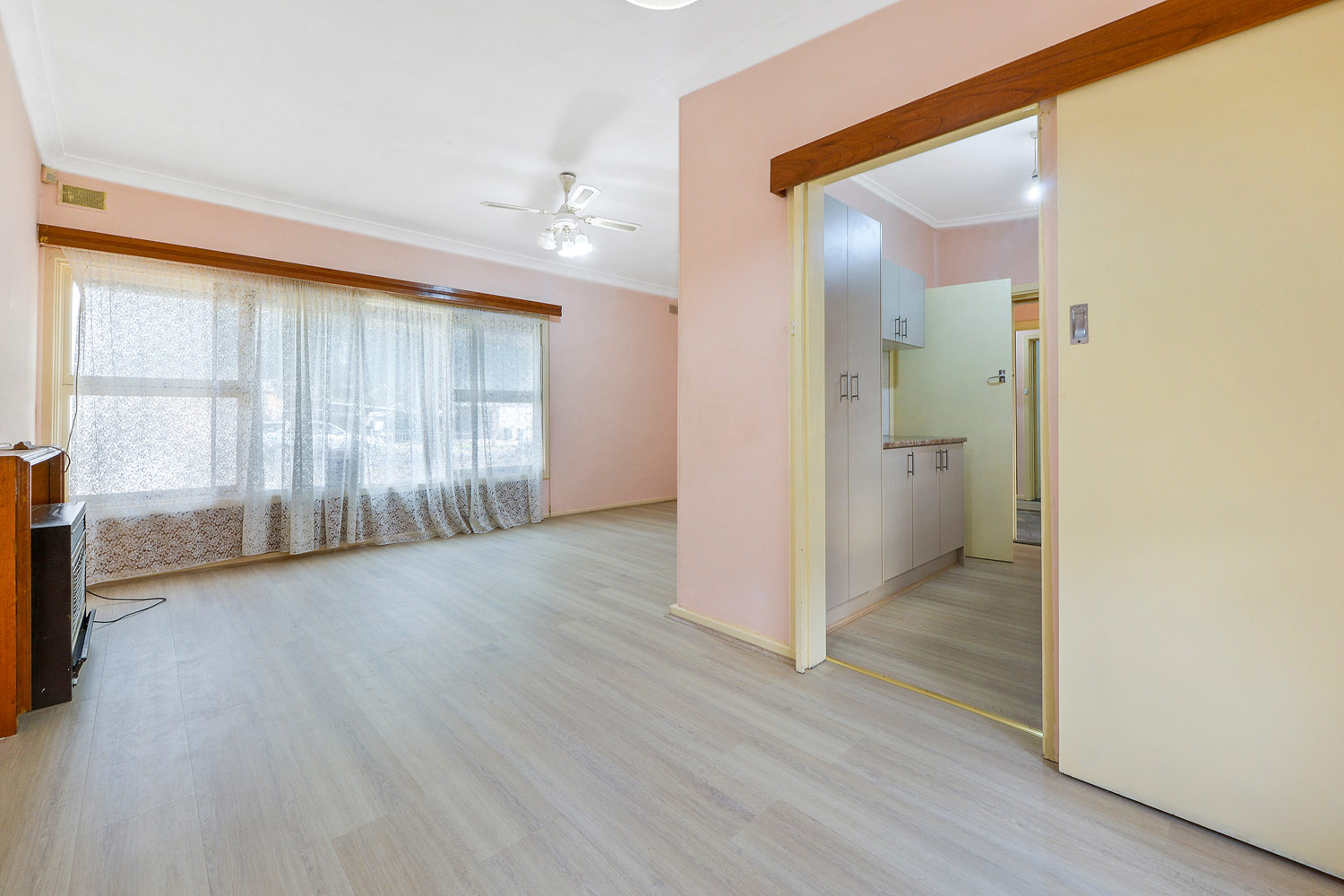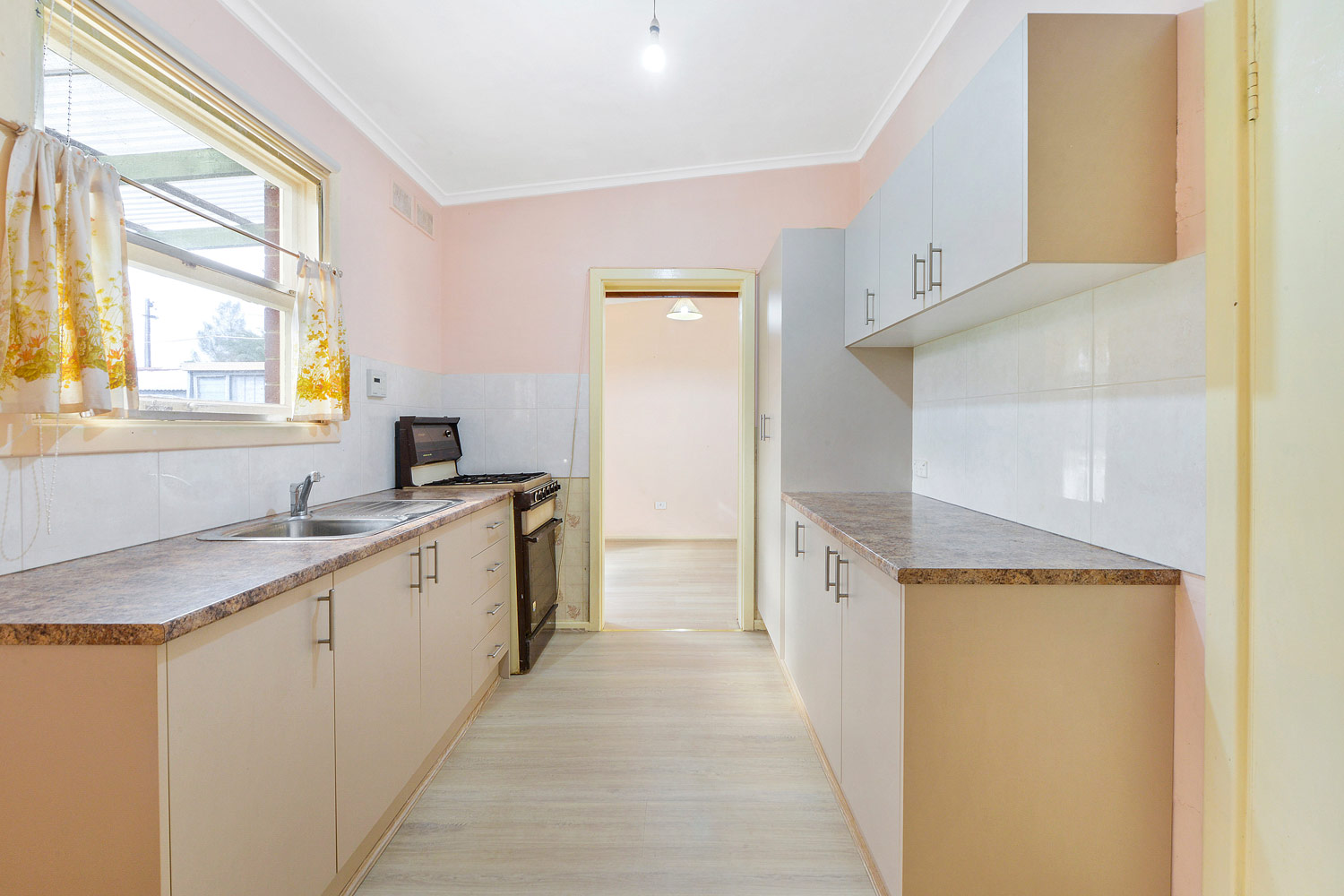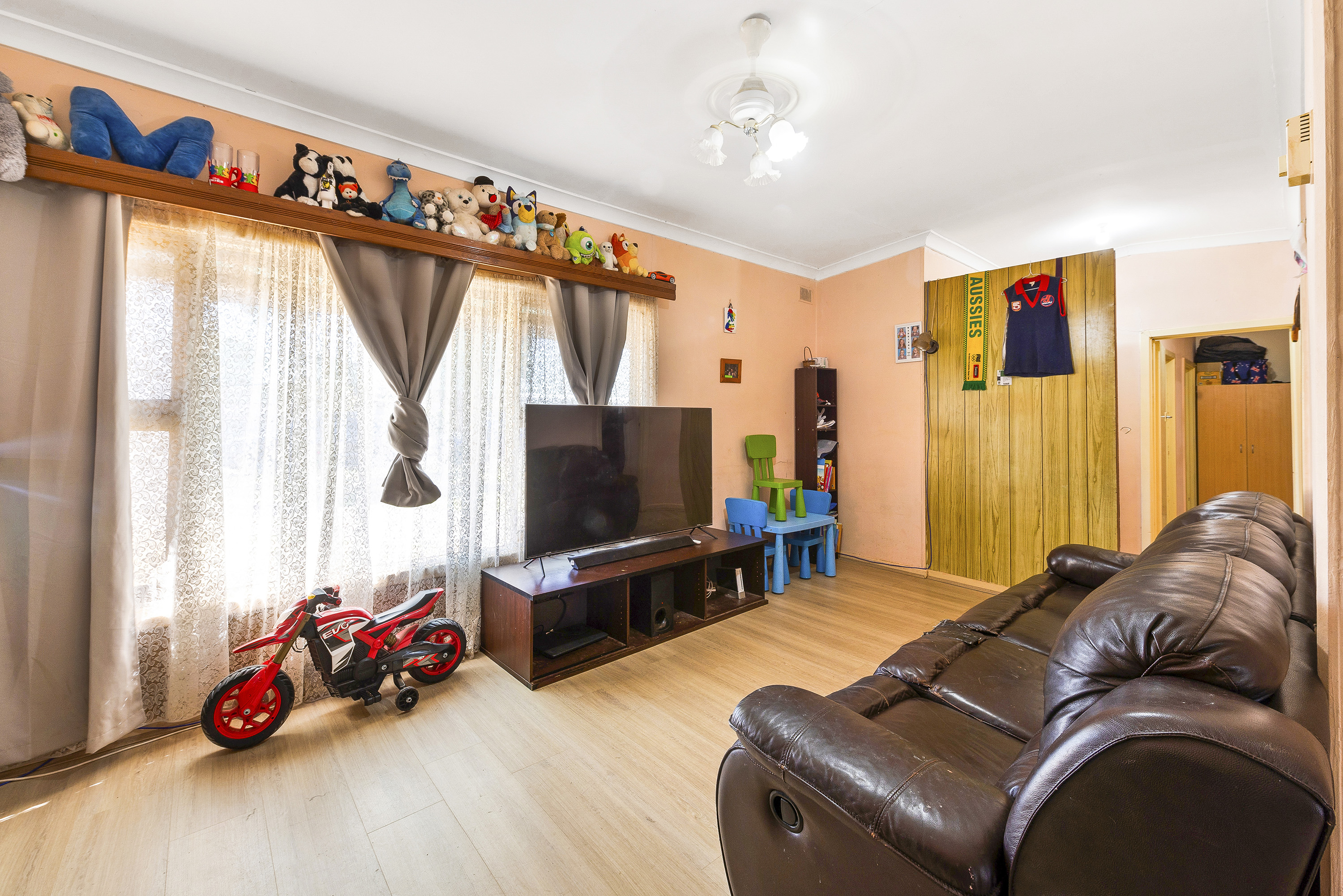 A traditional design features 3 spacious bedrooms across a generous 6 main room design. A spacious L shaped living/dining room offers crisp floating floors, ceiling fan wall air-conditioner and gas heater, while a bright galley style kitchen features stone look bench tops, meet cabinetry, wide sink and free-standing gas stove.