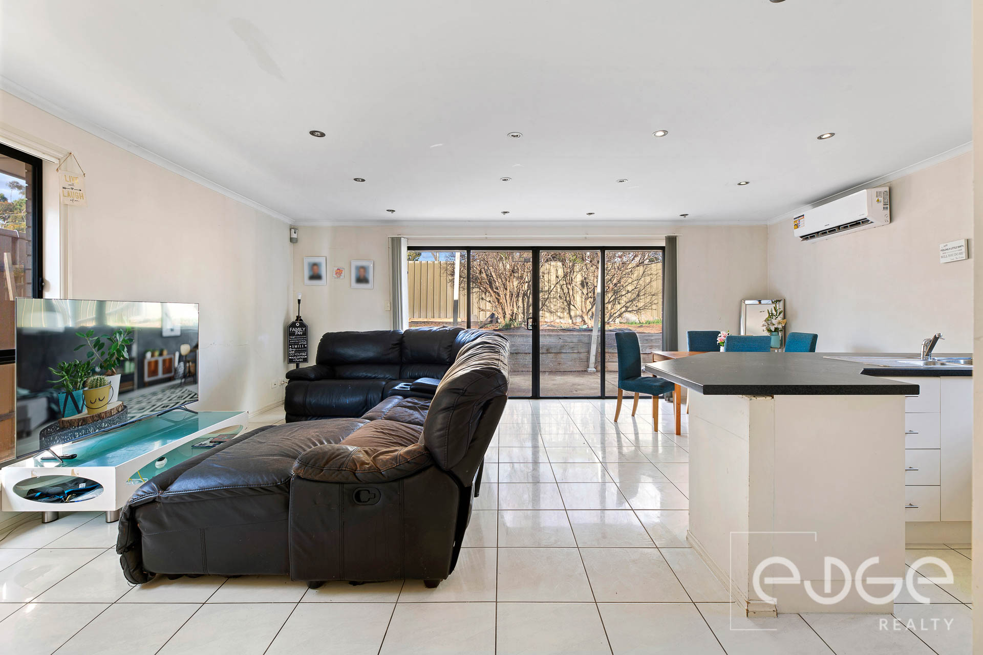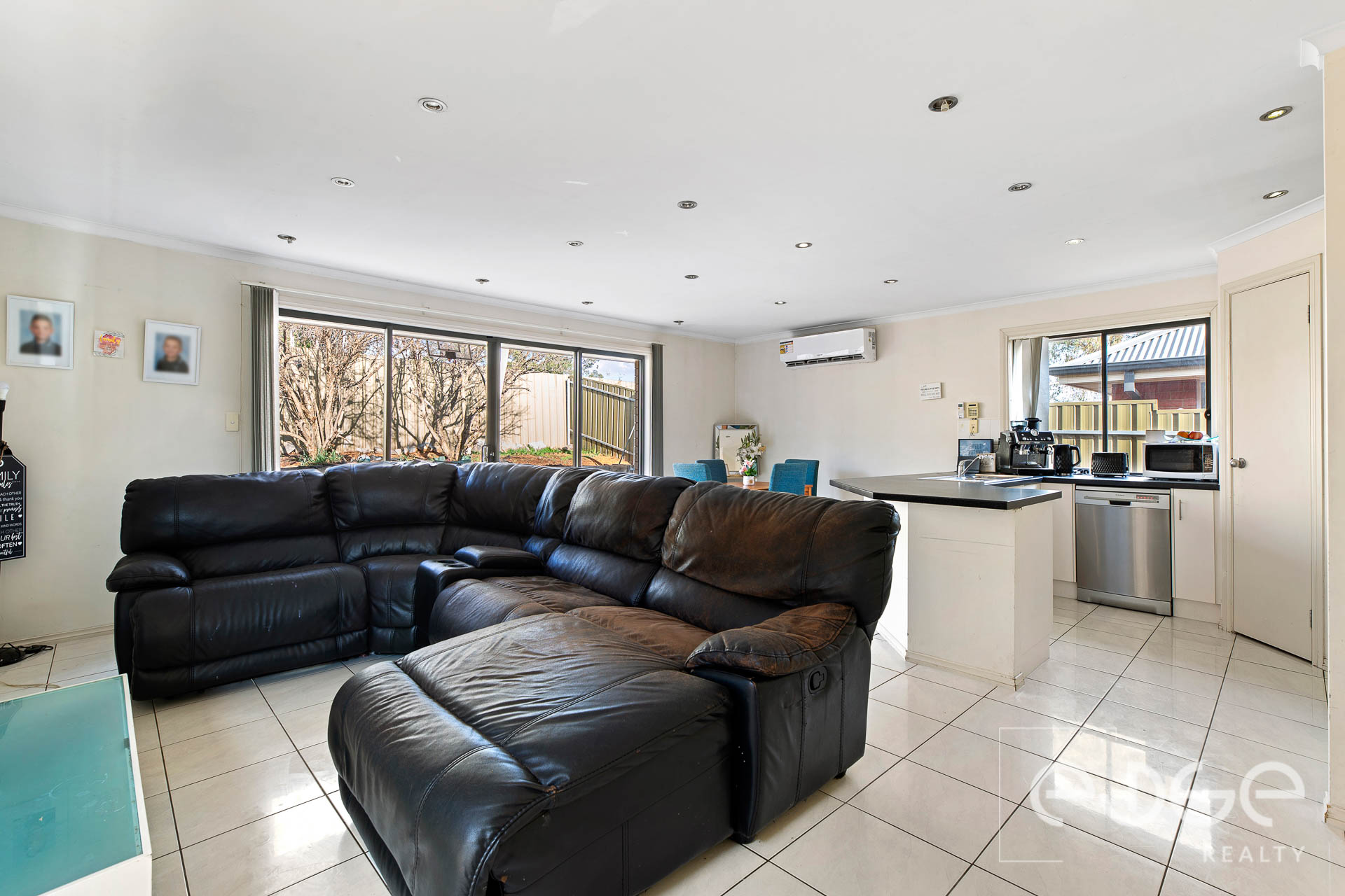 Step into the light-filled open-plan living, kitchen and meals area, which is bathed in natural light thanks to large windows and featuring stylish downlights. Vertical blinds offer privacy and control over the incoming light, while the tile flooring provides a sleek and elegant finish.
